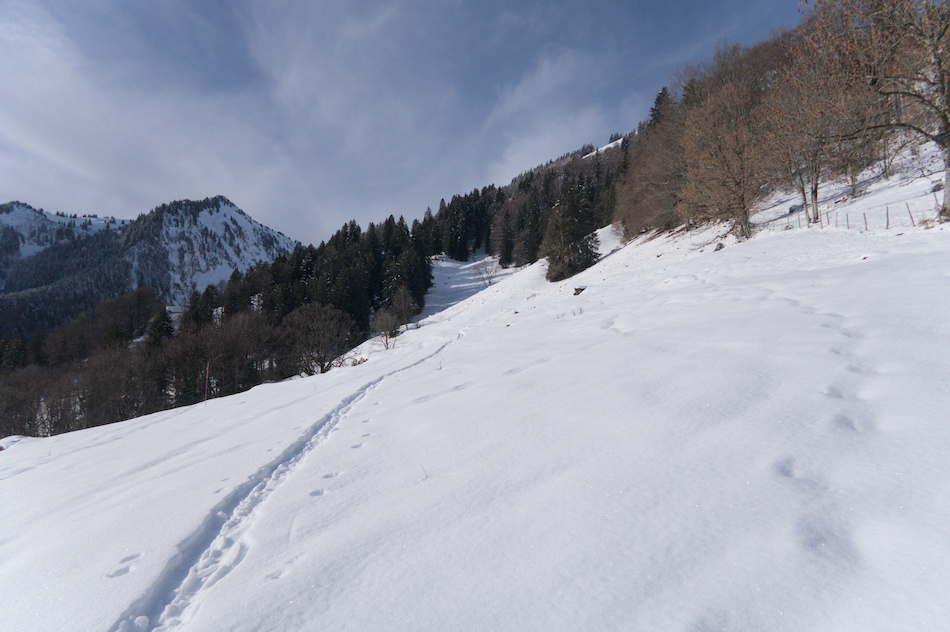 Enneigement maigre sur le bas (au dessous de 1'200m), ça passe tout juste, mais les cailloux sont pas loin et la neige est croutée.